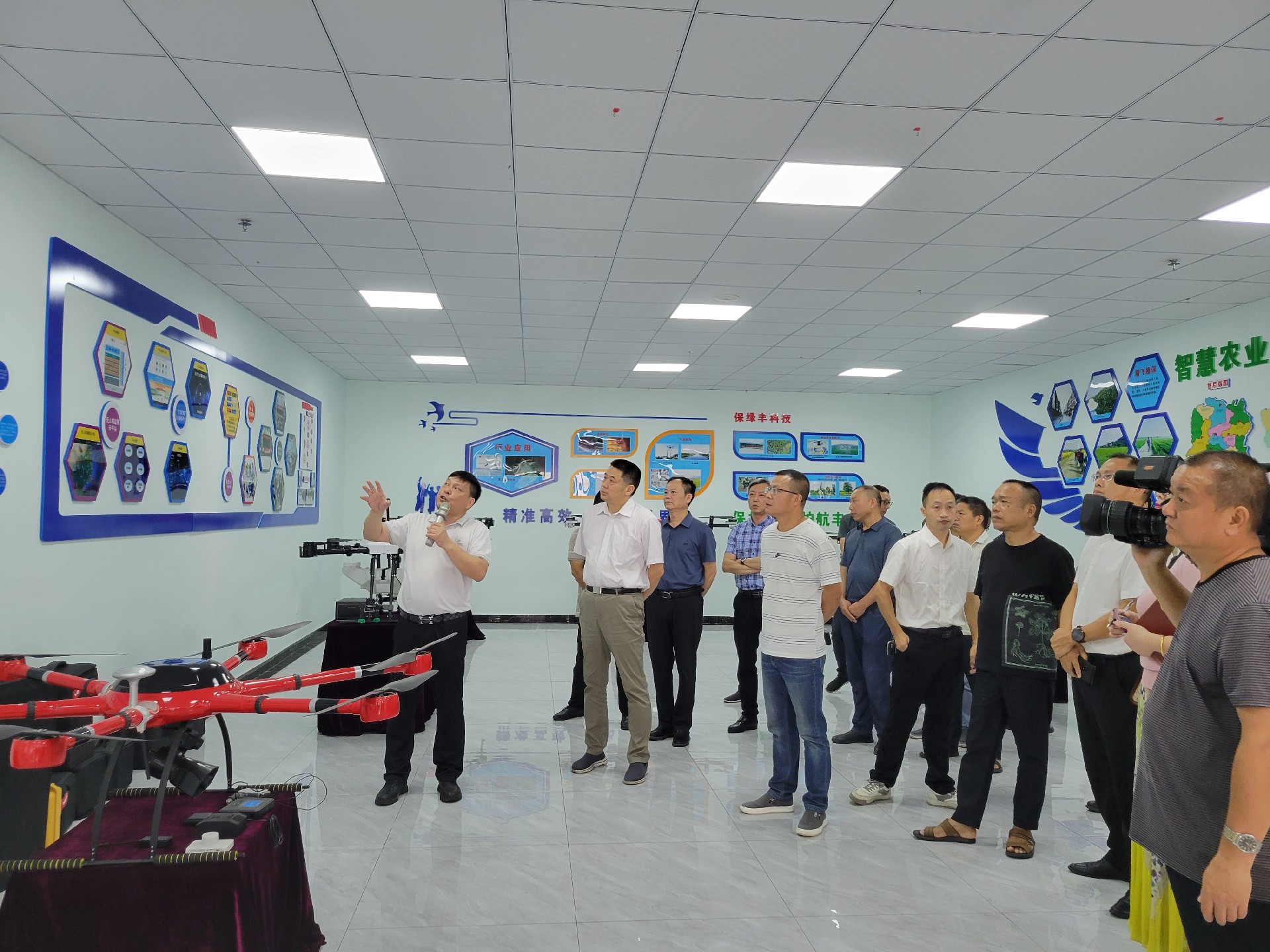 在精飛智能展廳,精飛集團董事長龍永堅向調(diào)研組一行匯報了企業(yè)生產(chǎn)經(jīng)營、技術(shù)研發(fā)、產(chǎn)品銷售等情況,其中重點講解了無人機數(shù)字農(nóng)業(yè)服務(wù)應用示范建設(shè)項目及自主開發(fā)的全國首個“北斗+無人機數(shù)字農(nóng)業(yè)綜合應用與公共服務(wù)”平臺運營情況。
