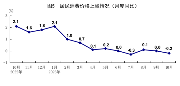 10月份,全國(guó)居民消費(fèi)價(jià)格(CPI)同比下降0.2%,環(huán)比下降0.1%。分類別看,食品煙酒價(jià)格同比下降2.1%,衣著價(jià)格上漲1.1%,居住價(jià)格上漲0.3%,生活用品及服務(wù)價(jià)格下降0.6%,交通通信價(jià)格下降0.9%,教育文化娛樂價(jià)格上漲2.3%,醫(yī)療保健價(jià)格上漲1.3%,其他用品及服務(wù)價(jià)格上漲3.6%。在食品煙酒價(jià)格中,豬肉價(jià)格下降30.1%,鮮菜價(jià)格下降3.8%,糧食價(jià)格上漲0.6%,鮮果價(jià)格上漲2.2%??鄢称泛湍茉磧r(jià)格后的核心CPI同比上漲0.6%。1-10月份,全國(guó)居民消費(fèi)價(jià)格同比上漲0.4%。